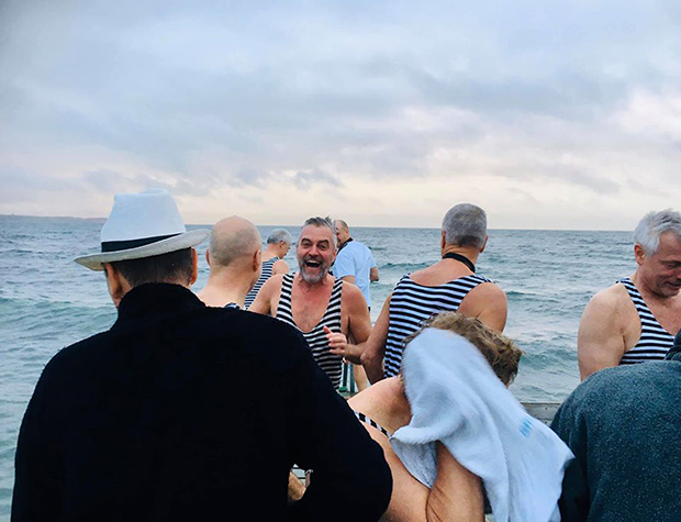 - Arkivfoto fra sidste års badetur i Risskov. Manden i midten med front mod kameraet er vinterbaderklubbens bademester.