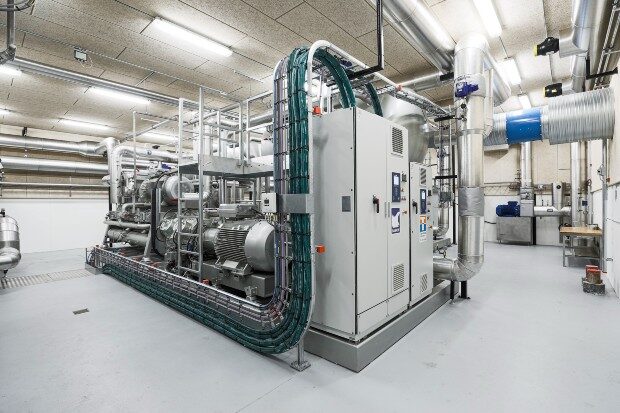 Den nye varmepumpe hos Hedensted Fjernvarme er en investering i grøn omstilling. Fjernvarmeværket har fået finansieret den nødvendige energirådgivning gennem det midtjyske REFER-projekt, der har fået midler af Den Europæiske Finansieringsbank til at understøtte omstillingen til energieffektiv og CO2-besparende teknologi i fjernvarmen. Hedensted Fjernvarme er et af 24 naturgasfyrede fjernvarmeværker i Region Midtjylland, der er med i projektet. Foto: PlanEnergi.