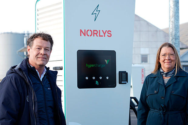 Søren Nybroe, Salgschef Truck Danmark sammen med Ellen Trolle, direktør for Norlys ladestanderforretning. Pressefoto