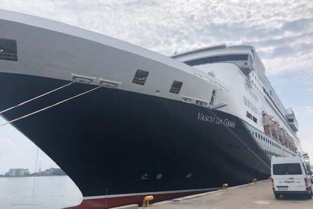 ”Vasco Da Gama” fra Tyskland var det første krydstogtsskib siden 2019, der 14. juli i år fik lov at sende gæster i land, men kun hvis de alle var vaccinerede, og som det ses på billedet var politiet til stede for at foretage kontrol. Skibet anløb en række danske havne og sluttede sin Danmarks-turné i Skagen. Her ved Langeliniekaj i København. Foto: Danske Havne.