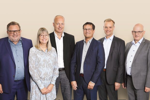 Den samlede direktion i Sparekassen Danmark består af (fra venstre) adm. direktør Per Sønderup, Lisa Frost Sørensen, Jan Skov, Kim Mouritsen, Lars Thomsen og adm. direktør Vagn Hansen.